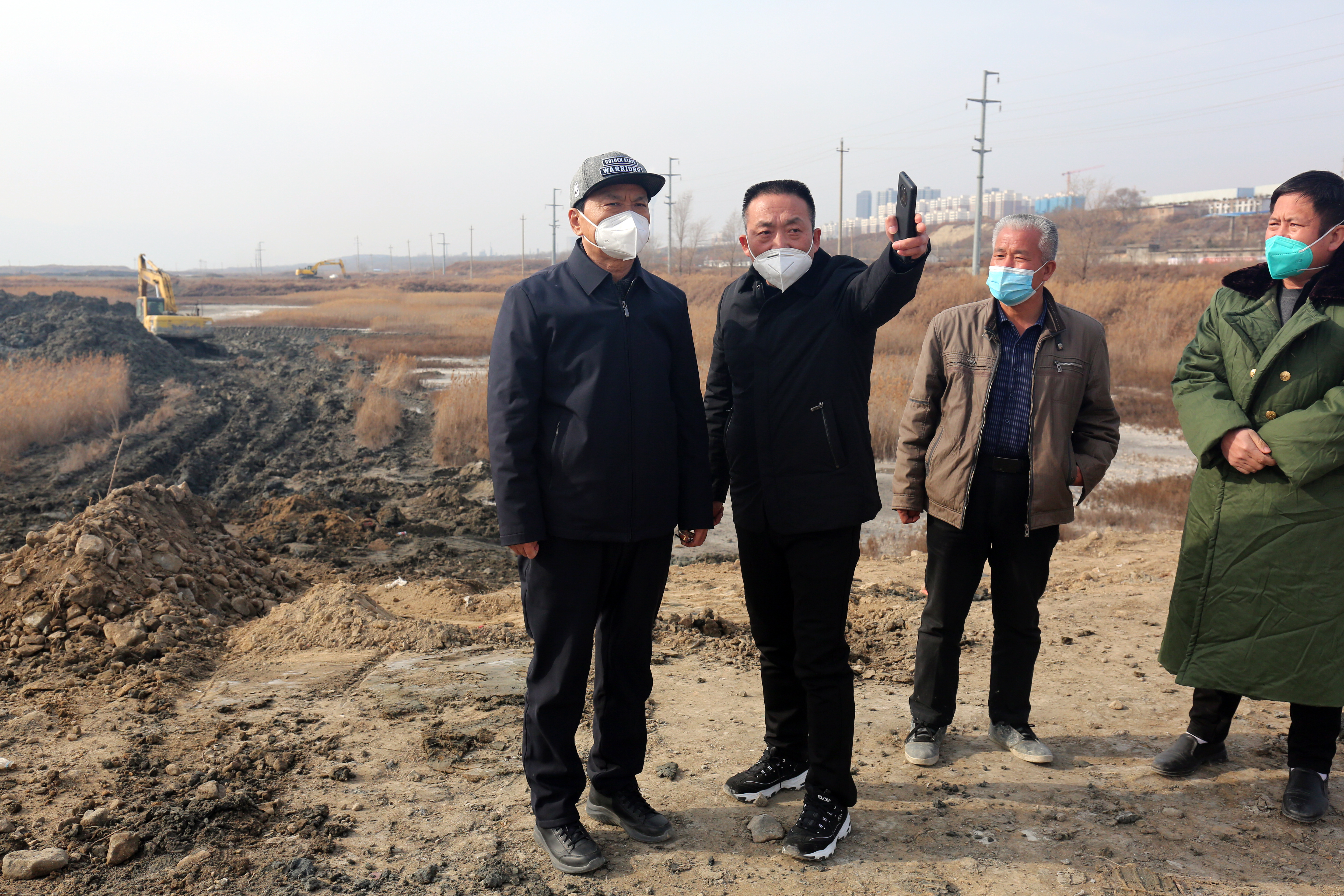 每到一處,詳細詢問施工人員康復情況、查看工地建設情況。干河清水復流段到處都是忙碌的工人,有安裝鋼壩閘的,有貼花崗巖的,有安裝欄桿的等;鹽湖生態(tài)治理工地上機械轟鳴,挖掘機、鏟車、挖泥船等20余臺大型機械有序運作,施工人員搶抓工期,處處涌動著建設熱潮。