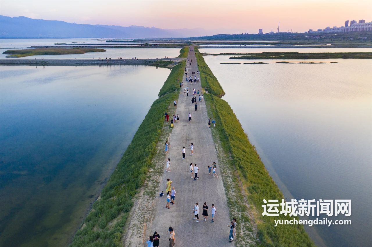 清晨6點,中條山下涼風(fēng)習(xí)習(xí),靜謐清麗。但圍繞鹽湖岸畔的步道上,穿著清涼晨跑的,扯著嗓子練聲的,舉著相機(jī)拍照的,人來人往,生命涌動的力量激蕩著黎明的寧靜。待清晨的第一縷陽光瀉向湖面,自帶柔光濾鏡,碧波浩渺,遠(yuǎn)山蒼茫,美得不可方物。
